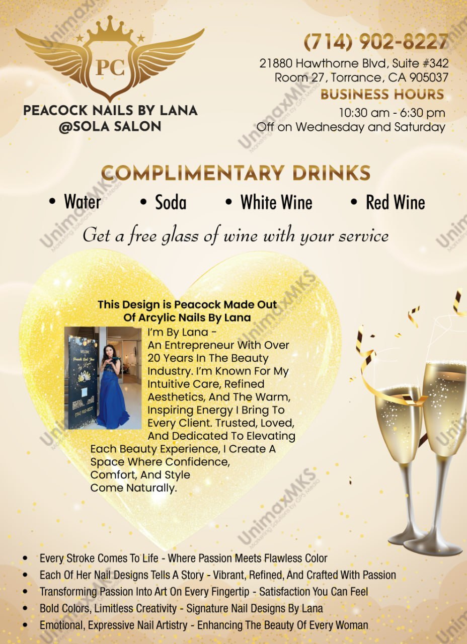 Located at 21880 Hawthorne Blvd, Suite #342, Room 27, Torrance, CA 905037, Peacock Nails By Lana is the perfect destination for those who seek perfection and sophistication in nail and beauty care. With a cozy, modern atmosphere and a team of skilled technicians, we bring you a truly relaxing experience — where every detail is crafted with care and passion.